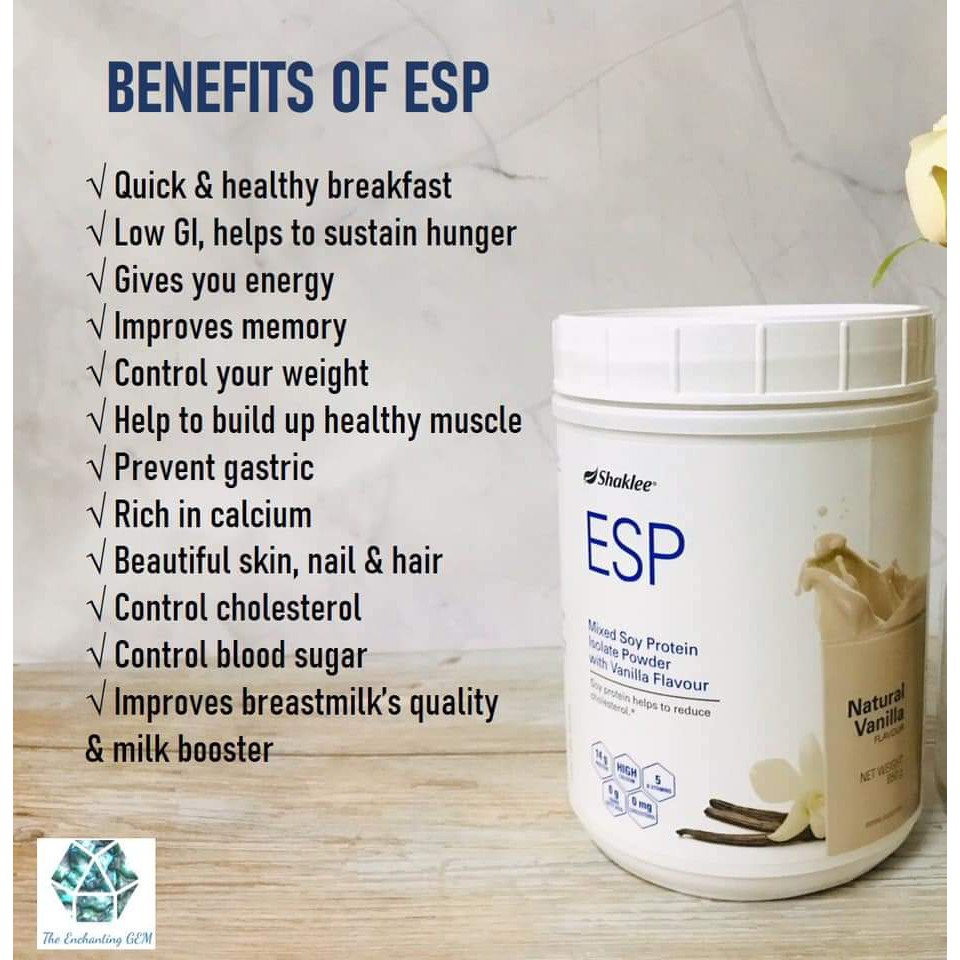Dalam setiap satu tin ESP Shaklee yang beratnya 850g sernbuk ESP Shaklee dihasilkan daripada 30 kg kacang soya. Para Ibu yang mengambil ESP Shaklee sebagai supplement tambahan untuk memperbanyakkan susu Ibu juga harus memastikan pengambilan air putih yang mencukupi. Membekalkan 9 asid amino penting yang tidak dapat dihasilkan.